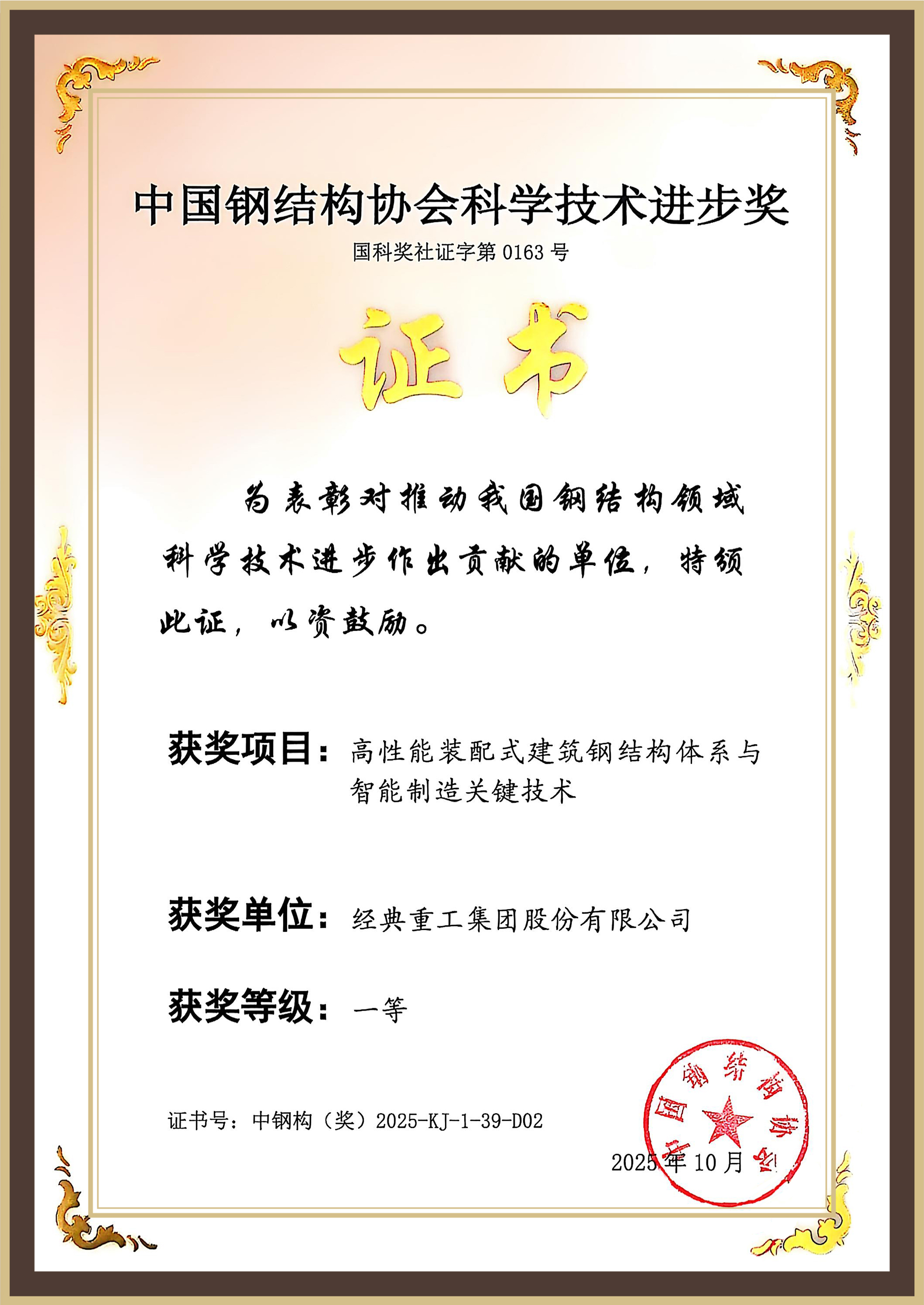 在科學(xué)技術(shù)獎頒獎典禮上,經(jīng)典重工集團股份有限公司作為主要科研單位參與的《高性能裝配式建筑鋼結(jié)構(gòu)體系與智能制造關(guān)鍵技術(shù)》項目榮獲中國鋼結(jié)構(gòu)協(xié)會科學(xué)技術(shù)進(jìn)步獎一等獎。